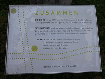 So ist es an den beiden vom Bildhauer Bernd Moenikes geschaffenen Skulpturen vor unserer Kirchengemeinde und der benachbarten katholischen Sankt Clemens-Gemeinde zu lesen - zusammen geschaffen aus dem Stamm der sogenannten Kaisereiche, die bis 2011 auf unserem Kirchplatz stand.