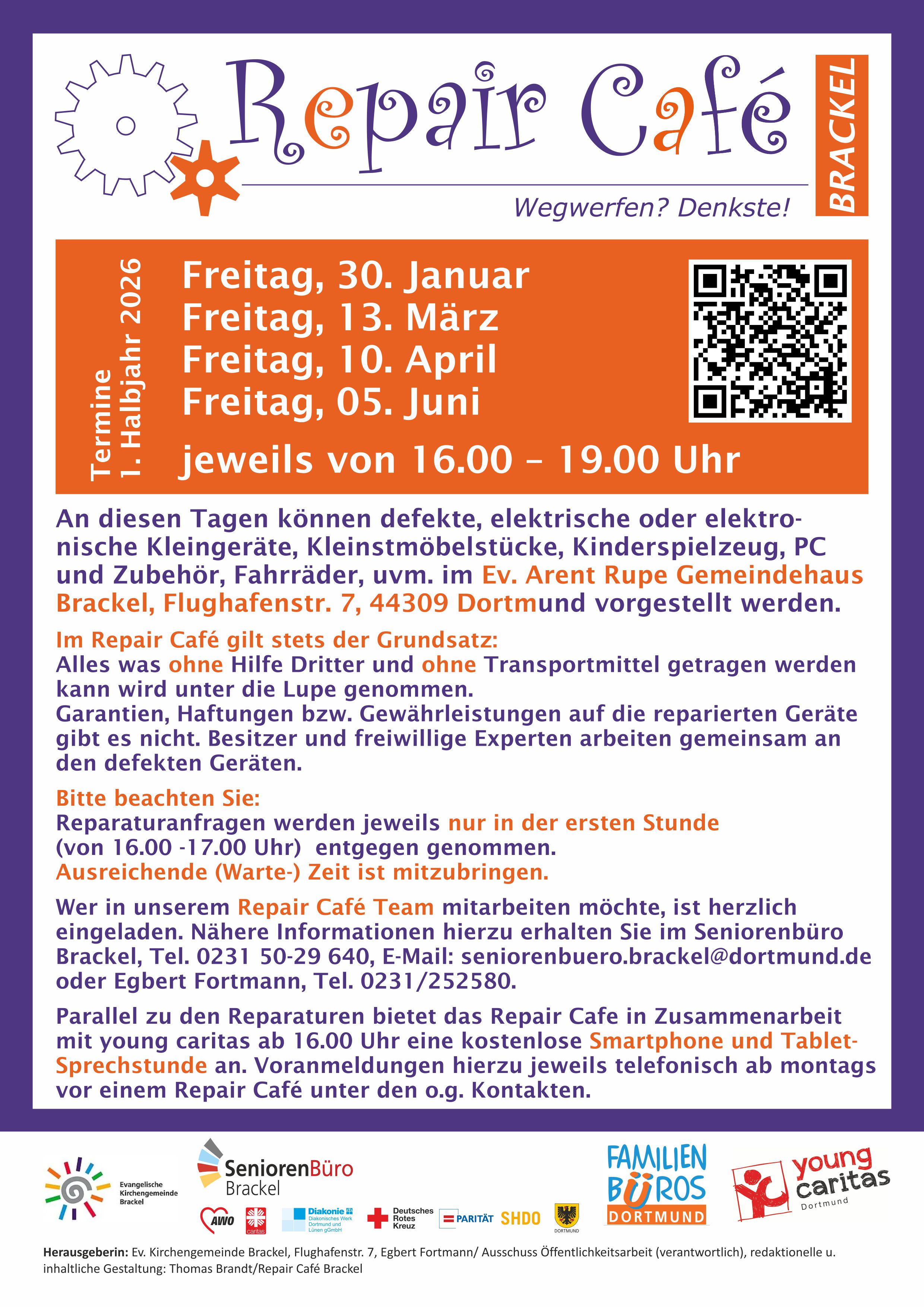 Das Repair Café wird ab 2026 von der Ev. Kirchengemeinde Brackel durchgeführt in Zusammenarbeit mit dem Seniorenbüro Brackel
